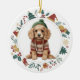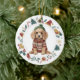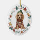 Den här söta Helgdag har en vattenfärgsbild av en aptitlig spanska Cocker-valp som är klädd i hans vintersötare och hatt. Bilden är inramad i en färglös krans som består av olika Helgdag, inklusive snögubbe, klockor, candy cane, strumpor, holly och mycket mer! Baksidan av dekoratet har samma utandningsbild med anpassningsbarna i grönt, guld och rött.