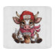 A cute cartoon cow sits sipping an iced coffee through a straw. She has brown and white spots, a pink scarf, and brown boots. On her head rests a red beanie with the words “Coffee Addict” written on it.