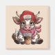 A cute cartoon cow sits sipping an iced coffee through a straw. She has brown and white spots, a pink scarf, and brown boots. On her head rests a red beanie with the words “Coffee Addict” written on it.