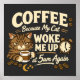 Cute poster ideal for coffee lovers and cat lovers featuring a grumpy looking cat holding a mug of morning coffee. In fun text are the words, "Coffee, because my cat woke me up at 5 am again". Other images around the design are an alarm clock set to 5, coffee beans and a little moon and sleepy Z signs.