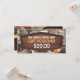 Föreställ dig den oemotståndliga aromen av nybryggat kaffe som blandas med den söta värmen av nybakade pastejer och som bjuder in kunderna till att fördröja. Om er kaffekvarstad släcker den mysiga, välkomnande atmosfären, varför inte den med världen genom en tänkbart designad presentkupong? Ett attraktivt presentkort för kaffebutiker för att uppmuntra fler kunder till kom genom sina dörrar med en design som har rustika trätukar, en utsvävad kafébakgrund, allt i rik bruna tonar. På framsidan ställer du in din presentkupong prist och på baksidan av kaffebutiken, platsen, det mobila numret, e-postnumret och webbplatsen, tillsammans med villkoren och villkoren för ditt erbjudande. Det här presentcertifikatet är designat för att fånga det väsentliga i din café och kommer inte bara att höja din professionell utan även locka kunder att uppleva den värme och smak du erbjuder.