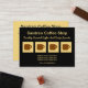 Anpassadecoffee shopvisitkortar. Tillfoga ditt eget specificerar noterar in. Bilder av kaffe koppar. Bakgrund är svart. Du kan ändra färg av bakgrund, som du önskar såväl som stilen av stilsorten. Dra tillbaka av denna coffee shopvisitkort kan användas som ett lojalitetbelöningkort, som ditt bemanna kan sätta stället ett frimärke på. Om detta inte krävs, kan detta enkelt tas bort från kortet.
