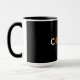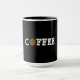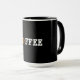 I mugg finns ord COFFEE i vit text med brev O ersatt med en klump i klump som är "Bra för en kaffe". Det här kaffet älskare mugg är designat att vara nästan helt svart inuti och ut med bara antydningar om de vita och mässing accents.