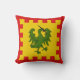 “Or, a duck rising to sinister, wings displayed vert maintaining in its beak a dagger sable, a bordure embattled gules.” Back of pillow is a Renaissance-era pattern in coordinating colors.