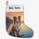 Collie hund som sitter vid en sjö vid solnedgång. Lägg till denna bild till andra produkter. Lägg till din egen text också. Massor av husdjur i mina butiker.