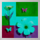 A vibrant color-block floral artwork featuring soft flowers and playful butterflies.