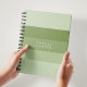 Personlig Colorblock Notebook med Vågrät Rand i Sage Grönt och Olive Tones. Den bärbara datorn har en elegant färgblocksdesign och visar fem vågrät rand i mjuk sage, muterad olivolja och blek grönt hues - vilket framkallar en naturlig och lugnande estetik. Du kan enkelt anpassa omslaget genom att lägga till ditt namn, skapar det som en tankfull och elegant gåva.