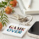 A keychain with "GAME OVER" in colorful 3D letters on a white square background. It's placed beside a smartphone, notebook, and orange flowers on a table.