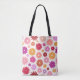 Colorful flower pattern in yellow, orange, pinks, lilac and reds on a cream color background.