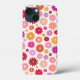 Colorful flower pattern in yellow, orange, pinks, lilac and reds on a cream color background.