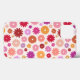 Colorful flower pattern in yellow, orange, pinks, lilac and reds on a cream color background.