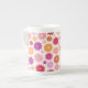 Colorful flower pattern in yellow, orange, pinks, lilac and reds on a cream color background.