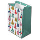 Den här färgstarka presentpåsen har en roligt mönster av boho stil Helgdag träd på framsidan och baksidan. Träd bilder är olika mönster och i tonerna tealblått, ljust rött, rosa, mörk blått och guld. Påsens sidor matchar helfärgad tealblått. Festiv och roligt för vem som helst!