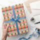 Winter holiday motifs in a colorful vintage color palette, decorate these gift wrap sheets. Featuring a fun bold color block pattern.