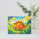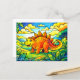 A cheerful cartoon dinosaur stands in a vibrant prehistoric landscape filled with rolling hills, palm trees, and fluffy clouds. Rendered in a bright watercolor style with bold outlines, the artwork blends playful colors and textures to create a whimsical, kid-friendly scene. The smiling dinosaur and lively background evoke imagination, adventure, and joy, making it perfect for children and dinosaur lovers alike.