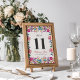 This Colorful Floral Botanical Modern Spanish Wedding Table Number design showcases a delicate floral border of vibrant pink, purple, blue, and red flowers intertwined with leafy green and golden branches. The colorful blooms, set against a soft cream background, create a lively yet elegant frame that draws attention to the central space for the invitation text. The combination of bright colors and intricate floral patterns adds a festive, joyful tone, perfect for a celebratory event like a wedding.