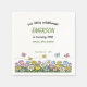 This “Our Little Wildflower” first birthday Welcome napkin is designed with a soft white background and a lively arrangement of bright, whimsical wildflowers and delicate butterflies blooming across the bottom border. The title “our little wildflower” is styled in a fun serif font, paired with your little one’s name in a bold comic font that adds a playful touch, while the party details are displayed in a matching serif font for a balanced, joyful feel. The vivid floral colors create a fresh, happy look, Simple to edit and customize with all your celebration details.