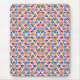 Colorful geometric pattern mouse pad with a vibrant mosaic design featuring blue, orange, and pink hues. An example image shows a white mouse on the pad.