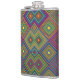 Colorful hip flask with a vibrant geometric diamond pattern in blue, yellow, green, and pink. The design creates a lively and energetic visual effect.