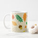 Kaffet mugg har ett färglöst mönster med höst löv, bär, pumpor, akorner och kastanjer på en beige bakgrund.