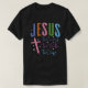 Den här svarta t-skjortan har en rosa kor till lämnat om "Vägen" i lila-skript, "Sanningen" i rosa-skript och "Livet" i blått skript, allt omgivet av vita stjärnor. Namn "JESUS" är överst i ett färgstarkt blockteckensnitt med blått, orange, rosa och grönt brev. Den här designen innehåller ett meddelande om religiösa.