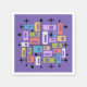 This artwork radiates mid-century modern energy, layering vibrant rectangles and squares of orange, green, blue, pink, purple, and white within a black grid of lines and dots. The composition is punctuated by playful black starbursts, evoking the optimism of the atomic age. Set against a deep purple background, the symmetry and bold color contrasts create a dynamic rhythm that feels both retro and timeless. The piece captures the spirit of 1950s–1960s design while offering a fresh, contemporary vibrancy.