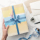 This beautifully wrapped gift box features a pastel color scheme, accented with a shiny red ribbon and a large bow. The box is set amidst festive pine branches, decorative pinecones dusted with white, and vibrant Christmas ornaments, creating a joyful and celebratory holiday atmosphere.