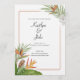 A tropical themed wedding invitation with colorful tropical greenery and florals.