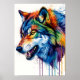 his vibrant watercolor wolf portrait explodes with bold rainbow colors including orange, blue, green, and purple, featuring dramatic paint drips and splashes for a modern artistic effect. Perfect for adding an eye-catching statement piece to any space that needs a bold pop of color and wild energy.