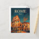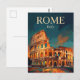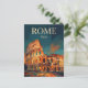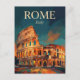 The Colosseum, an ancient amphitheater in the heart of Rome, transforms into a dramatic spectacle at night. The limestone arches are bathed in amber floodlights, creating deep shadows that emphasize its colossal scale and historical weight.