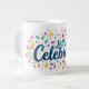 Det här pulserande mugg har en färgstark explosion av konfekt i nyanser av blått, rosa, gult och grönt. Den glada frasen "Låt oss fira!" står i fet, lekfull brev och skapar den perfekt för varje födelsedagsfirande!