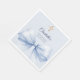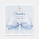 A light blue background color. Decorated with a large light blue colored bow and a golden cross. Personalize and add the name and date.