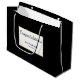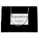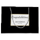 This black and white graduation gift back has black script you can edit to show a custom message. (Shown: Congratulations) Additional text is for personalizing the grad gift bag with the graduate's name and the year the student is graduating. The text is inside of a scalloped shape.