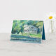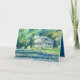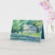 Congratulations on your new lake house greeting card featuring a home bordered with large green trees in the late afternoon shade with a lawn and rock border leading to the water hand drawn with ink and painted with watercolor. On the inside is a coordinating shade of blue and text you can edit to fit your needs.