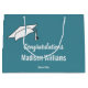 A white graduate's cap is above the white script that reads 'Congratulations'. You can edit the script if desired. Two lines of white display text are under the script. You can edit them to show the graduate's name and class year. The gift is a retro shade of blue that was popular in the 1970s.