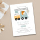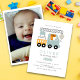 Den lilla dino som arbetar i bygget lastbil, imponera gäster på den här söta fantastisk-födelsedagen inbjudan, Anpassa med din lilla bild för att göra inbjudan till extra speciell