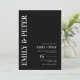 Contemporaryns Elegant Modern minimalistisk bröllopsinbjudan . Utformningen har en svart bakgrund med bröllop-detaljer skrivna i vitt och i ett söt teckensnitt. Skicka ut den här söta eleganten inbjudan till vänner och familj. Anpassa den genom att ändra namnen på paret och övriga detaljer. Inbjudan ingår i en samling. Checka ut samordningen Spara datumkort, OSA kort och tackkort i samlingen. Om du vill ha fler anpassningar kan du kontakta mig på mypaperlove2021@gmail.com
