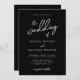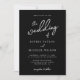 Notera bröllop med en fantastisk och modern design. En fet svart bakgrund och skarp vit typografi, som innehåller både elegantens skript och rent sans-serif typsnitt, skapar ett minnesvärt och chic påstående.