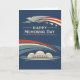 This Memorial Day design features a clean, modern patriotic style that emphasizes calm dignity and national unity. A stylized eagle in flight sweeps across the top, trailing a ribbon of red, white, and blue stars that suggest motion, freedom, and enduring memory. Centered text reading “Happy Memorial Day” is set in refined, minimalist lettering, allowing the message to speak with quiet strength. Below, a simplified domed memorial building rests on the horizon, symbolizing collective remembrance and civic honor. The deep navy background and flowing bands of color create a serene, contemporary composition suitable for respectful Memorial Day observance.