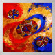 Continuum – A Colourful Black History Celebration. Movement flows across the canvas like time itself, linking past and present. The circular forms feel eternal, representing cycles of culture, migration, and survival. Gold illuminates the narrative, while red and blue strokes introduce rhythm and emotional intensity. The piece suggests that Black history is not segmented but continuous and evolving.
