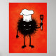 Halloween-matlagningsdesign med ett hårigt ont kryp - kock. Den ondskefulla karaktär som bär en kock som håller en spatel med onda flina som visar sina vassa tänder. Den här illustrationen av roligten har en intensiv orange med texturerad bakgrund.