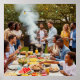 En grafik av hög kvalitet som gör att en sommarcookout blir varm och gemensam för alla produkter. Utformningen visar en mängd olika människor som samlas kring ett långt pickniskt bord.