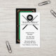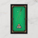 Billiards theme business cards in a cool custom design with graphic of an Eight Ball and pool cues logo and pool table design on the flip side. Designed for a bar or lounge, billiards hall, pool hall, or league or instructor.