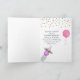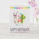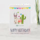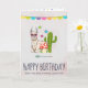 Ett roligt födelsedags kort med en fin flippad vimpelbanner längs toppen. Illustrerad med en söt lama som bär hjärtformade solglasögon. Några stjärnor, en svamp och en grön kaktus kompletterar illustrationen. Lekfull och söt.