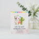 Illustrerad med en söt lama som bär hjärtformade solglasögon. Några stjärnor, en svamp och en grön kaktus fullbordar illustrationen. Whimsisk och söt.