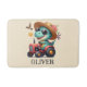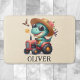 Denna personliga, söta badrumsmatta har en charmig och fantasifull bonde trex dinosaur med solglasögon som glatt kör en mini röd traktor.