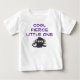 En trendig t-shirt för en modig bebisflicka eller -pojke med de anpassade orden "Cool tuff lilla en" (© Mira) i ett modernt, stilrent teckensnitt, och en rolig, söt seriefigur ninjamonkey-bebis. Jag designade den specifikt för en modig liten fighter som kämpade efter födseln med vissa hälsoproblem.