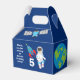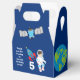 En coola rymden astronaut fick festens favoritbox i blått för en barn. Har ett fantastisk-barn astronaut bredvid en raketfrakt i galaxen. Sidorna är dekorerade med planeter, rymdskepp och planeten jorden. Anpassa med ditt tack för ett galaxistiskt temat-parti som gynnar paket.