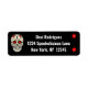 En färgfull etikett visar en skalle med hjärtan i ögon, blommor och kor på framhuvudet. Standardbakgrunden är svart, med röda blommor i två hörn. Använda den här goth-skallen mönster för Dia de los Muertos, Halloween, eller varje dag. Anpassa namn, adress och färg.