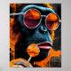 En lekfull och edgy illustration av en schimpans som rockar solglasögon med orange och håller en lollipop med orange. Den här teckningen smälter ihop stil med gata med popkonsfläkt mot bakgrund av fet orange och svarta färgstänk.
